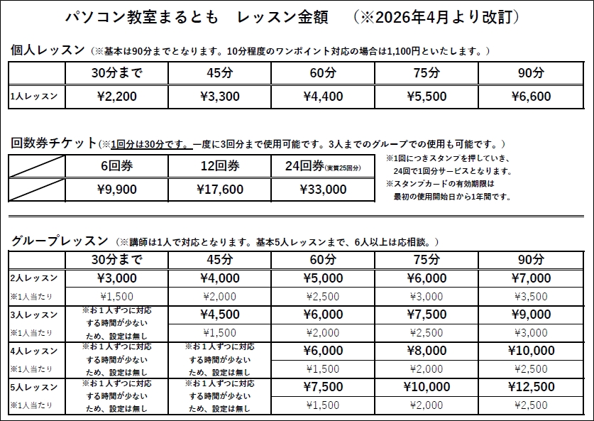 パソコンレッスンの時間および料金体系が変更となります。あらかじめご了承ください。
